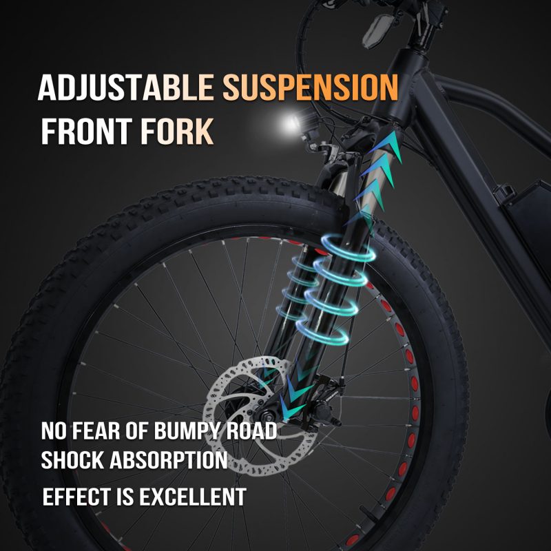 All terrain, including city commutes, are easily handled by the 26”*4.0 inch fat tires, especially handy for riding along the beach beside the surf and can even negotiate through rugged, dirt mountain and snow. And this bike can accommodate passengers up to 200Kgs in weight.