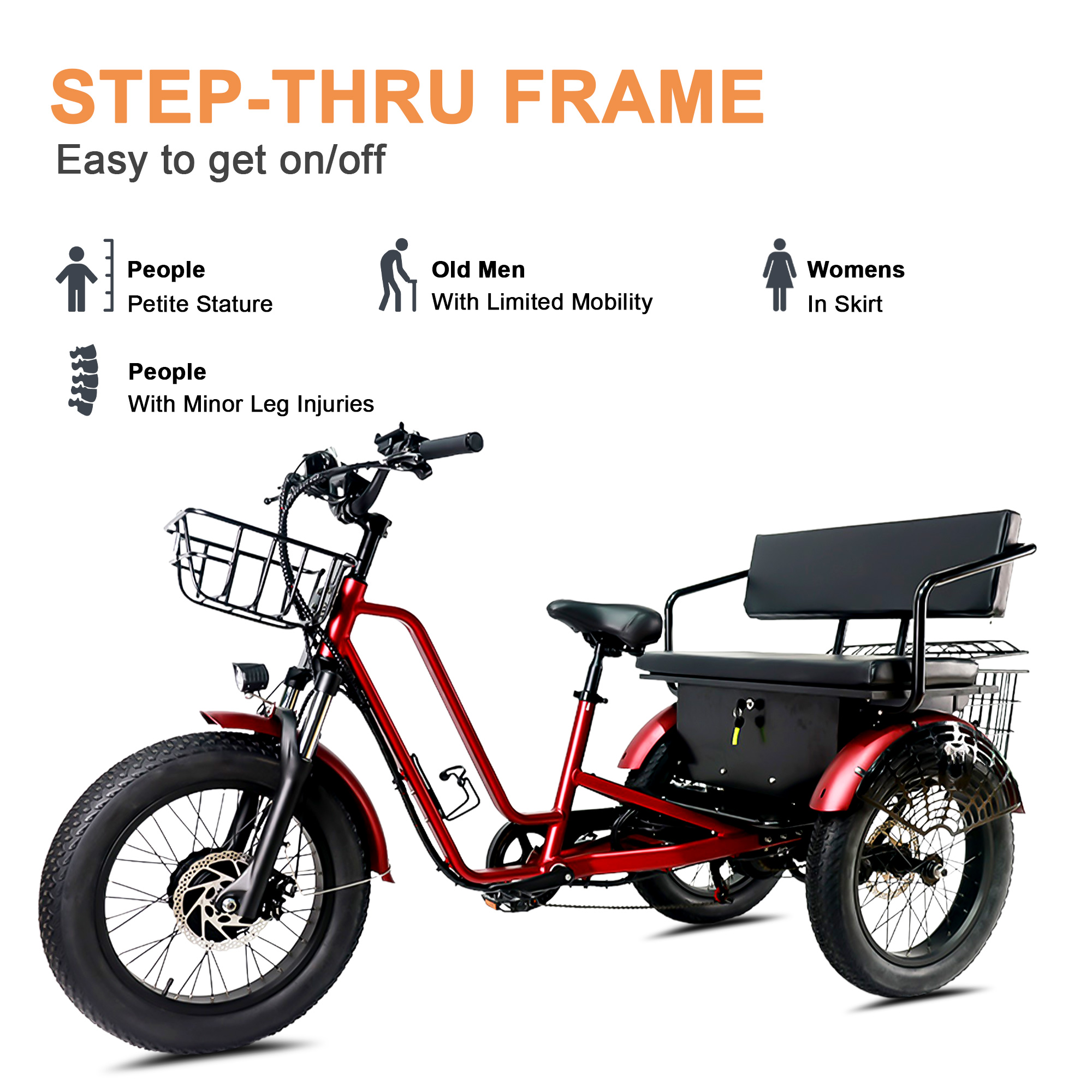 Whether you’re cruising through neighborhood streets, running errands, or exploring scenic trails, this electric trike delivers reliable performance and ample seating for up to 3 adults (or 2 adults + 1 child).