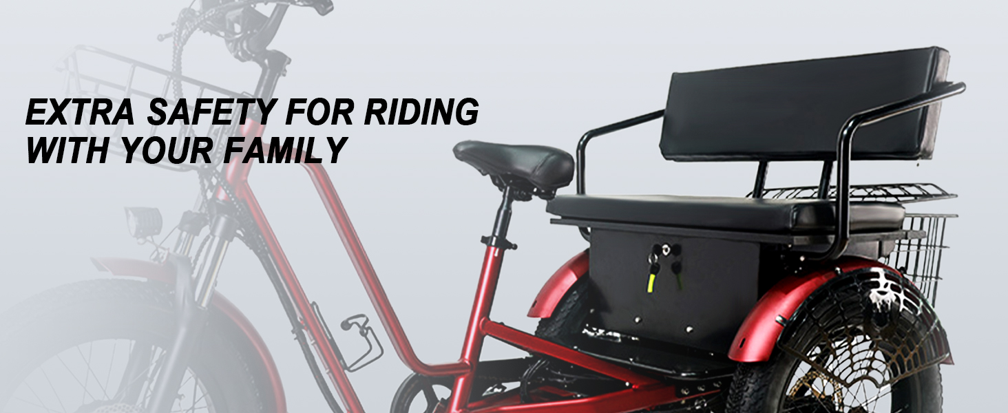 Experience the ultimate combination of comfort, stability, and versatility with our 3-Seat 3-Wheel Electric Bike!Designed for families, small groups, or anyone needing extra space, this fat-tire e-bike features a rear motor that ensures smooth turning and balanced power distribution—say goodbye to clunky maneuvering and hello to effortless rides.